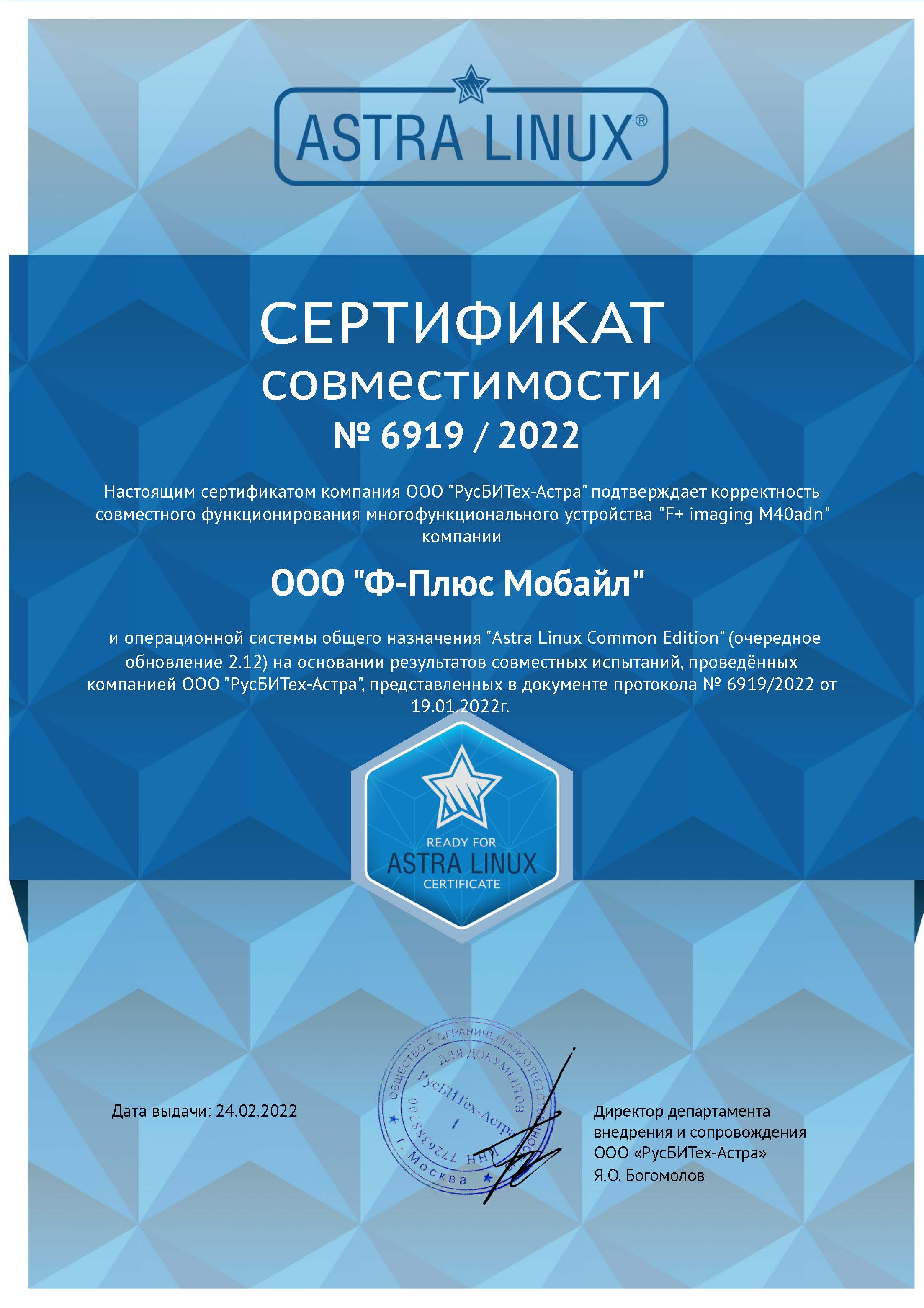 04.11.2022Сертификат совместимостиСертификат совместимости принтера f+ imaging P40dn, производства ООО "Ф-Плюс Мобайл" и операционной системы общего назначения "Astra Linux Common Edition" (очередное обновление 2.12)